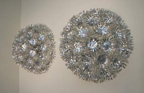 Hemispheric Twilight (side view of two) Cindy Loehr, Hiromi Yoshii Gallery, Tokyo 2006 title by Peter O'Leary a series of six sculptures steel and hand cut aluminum each approximately 24"h x 24" w x 12"d